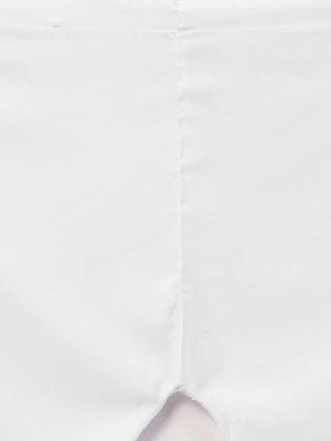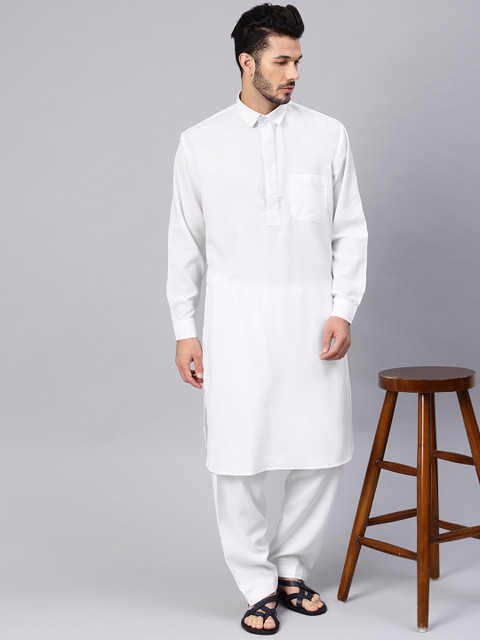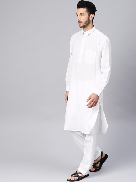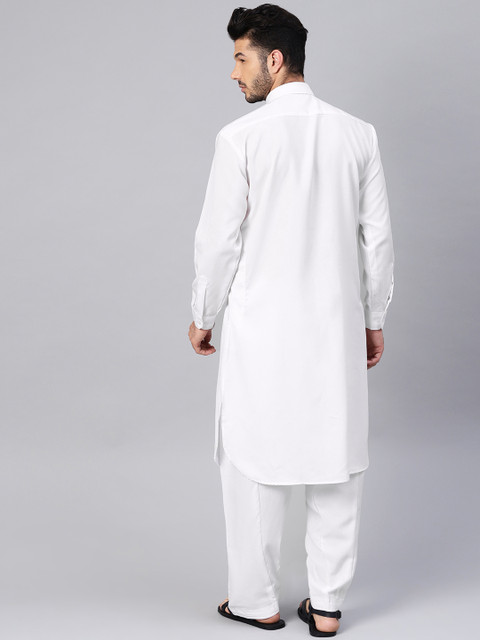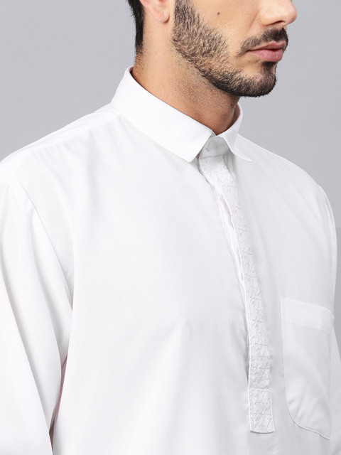 White solid Pathani knee length kurta with threadwork detail, has a shirt collar, long sleeves, curved hem, concealed button placket, side slits