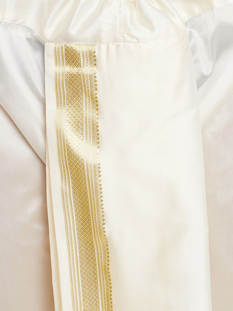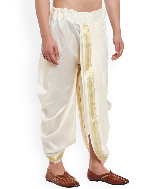A pair of off-white mid-rise dhoti pants with zari detail, has a waistband with a drawstring fastening