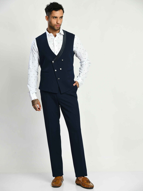 Navy blue solid waistcoat, has a v-neck , a full button placket, sleeveless, tuxedo , and two pockets
