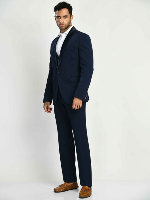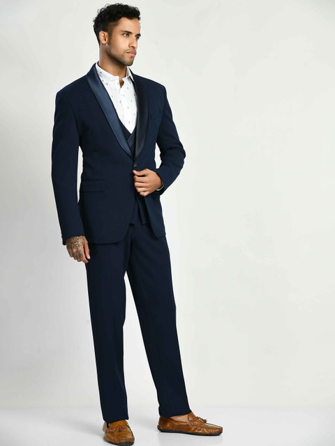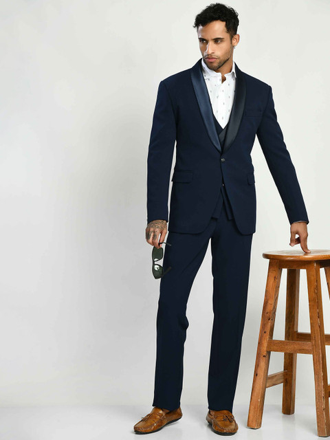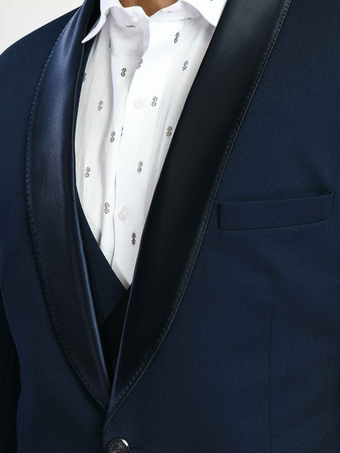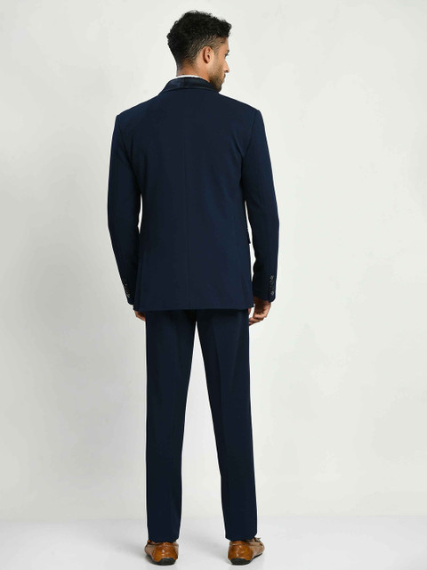 Navy blue solid blazer has a Notched Lapel collar , tuxedo with double button closure, long sleeves, one welt pocket and two flap pockets