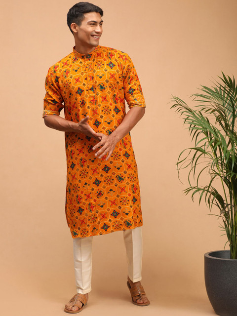 VASTRAMAY Men Yellow Cotton Blend Straight Kurta