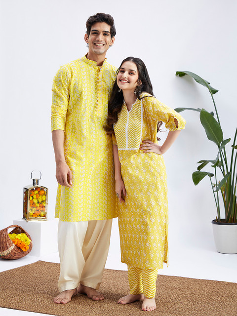 VASTRAMAY Men Yellow Ethnic Motifs Embroidered Chikankari Pure Cotton Kurta with Patiala