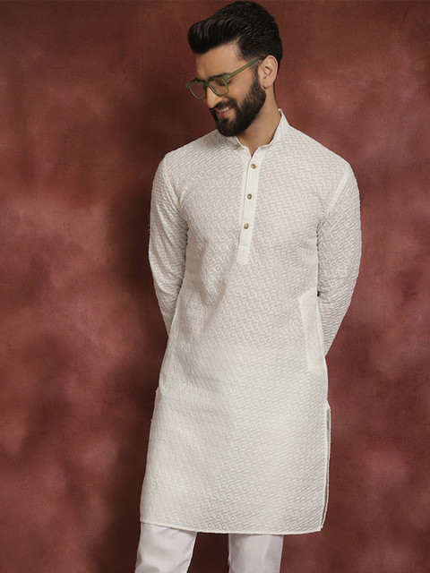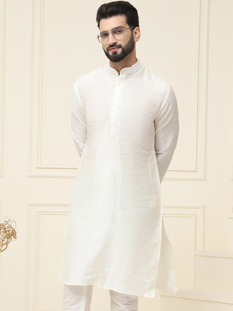 SOJANYA Men Off White Cotton Solid Above Knee Length Kurta