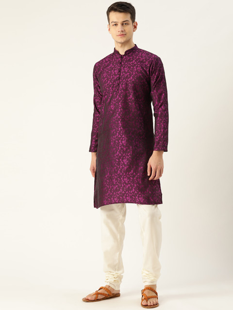 SOJANYA Men Magenta & Off-White Woven Design Kurta with Churidar