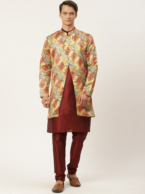 SOJANYA Men Maroon & Gold-Toned Solid Kurta with Dhoti Pants
