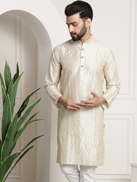 SOJANYA Men Off White & Golden Striped Straight Kurta