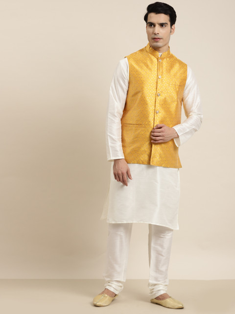 SOJANYA Men Off-White & Mustard Yellow Kurta & Churidar with Woven Design Nehru Jacket