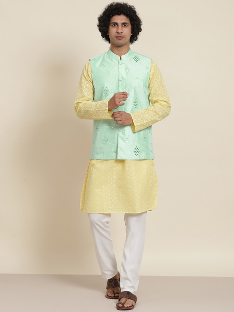SOJANYA Men Yellow Pure Cotton Kurta with Pyjamas & Nehru Jacket