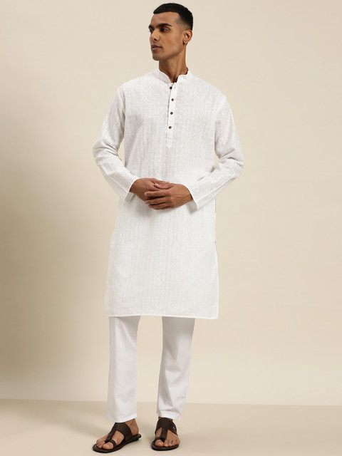 SOJANYA Men White Cotton Linen Solid Straight Kurta