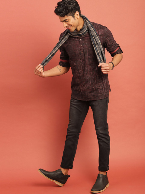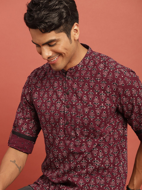 Taavi Men Maroon & Black Bagru Printed Straight Sustainable Kurta with Roll-Up Sleeves
