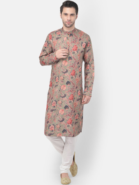 TABARD Men Olive Green Printed Pure Cotton Angrakha Kurta