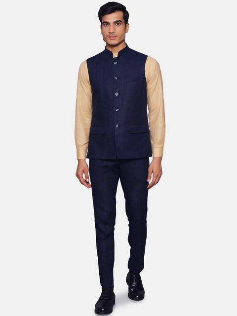 Wintage Men Navy Blue Solid Linen Bandhgala Formal Suit