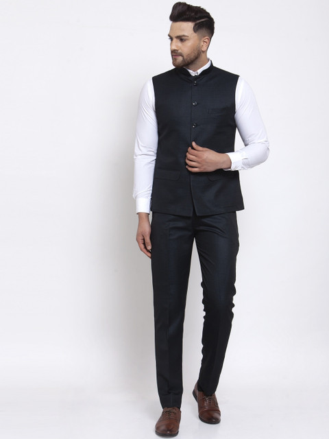 Wintage Men Teal Blue Self Design Bandhgala Blazer
