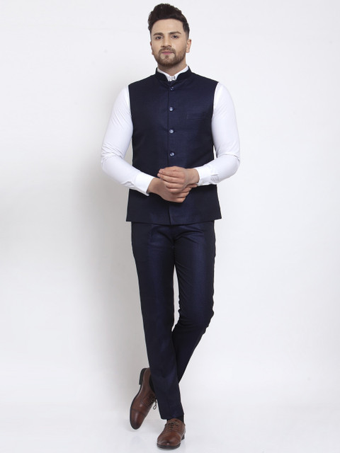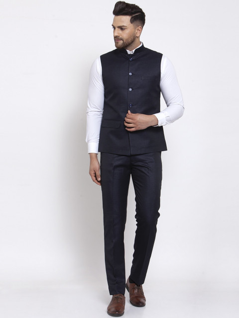 Wintage Men Navy Blue Solid Single-Breasted Bandhgala Formal Two-Piece Suit