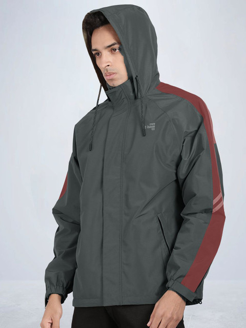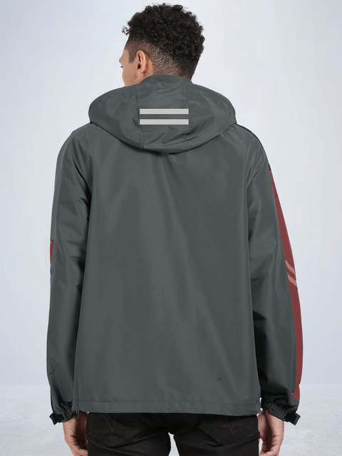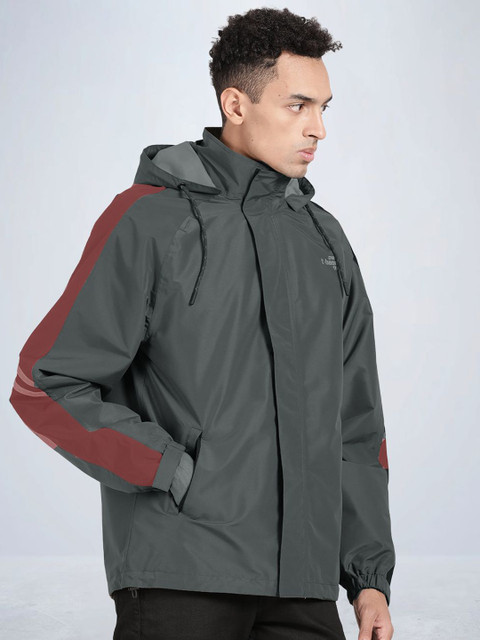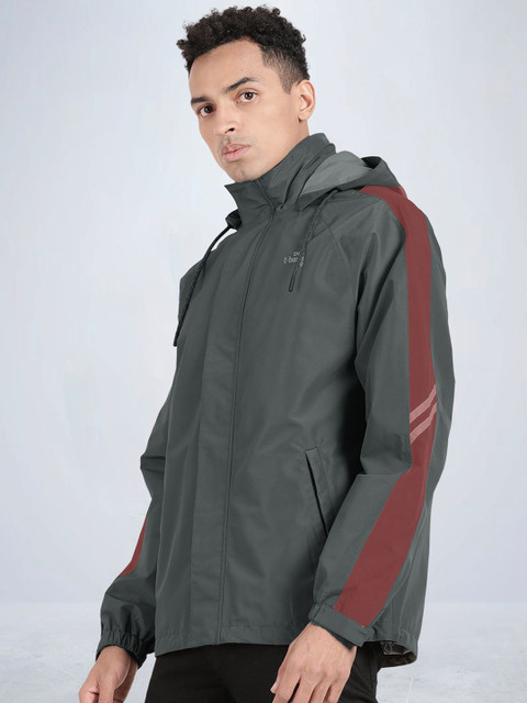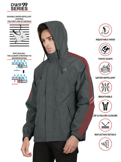Grey solid regular-fit hooded rain jacket, has an attached hood with drawcord toggle, seam-sealed with adjustable hems, a full front zipper placket with flap, cuffs and hood with drawcord, a packable hood and breathable vents at the back, and two flap zipper pockets