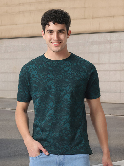 Urbano Fashion Men Teal Blue Tropical Printed Round Neck Pure Cotton T-shirt