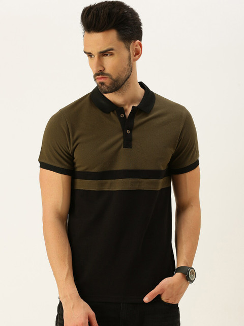 VEIRDO Men Olive Green Colourblocked Polo Collar T-shirt