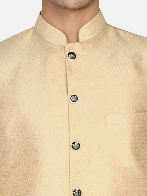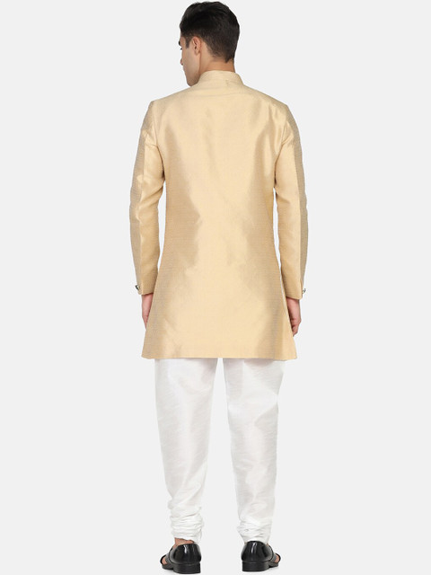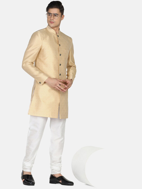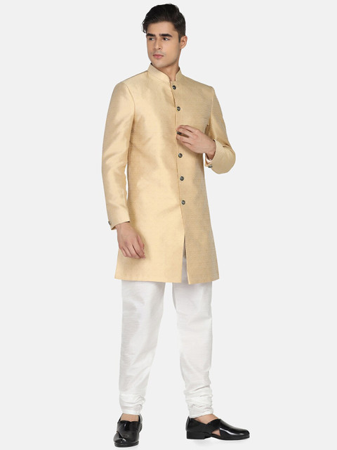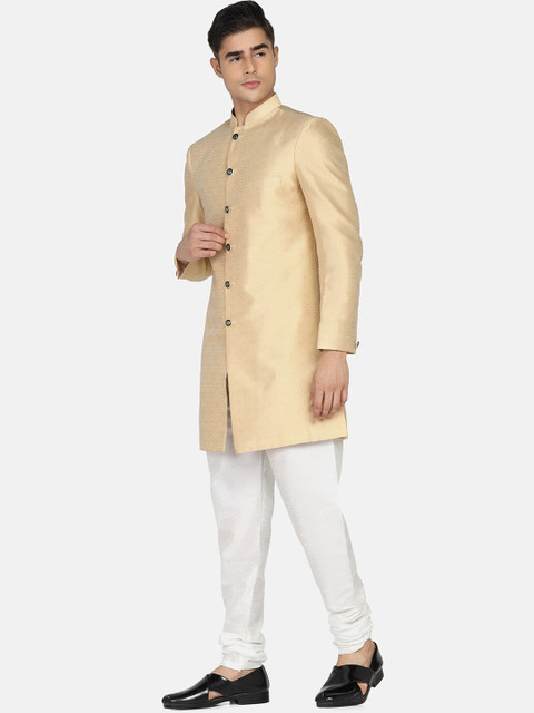 Gold-color solid sherwani, has a mandarin collar, front button closures and long sleeves