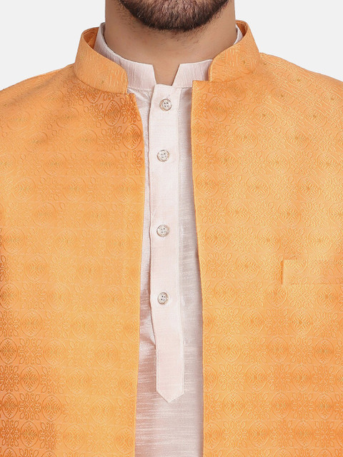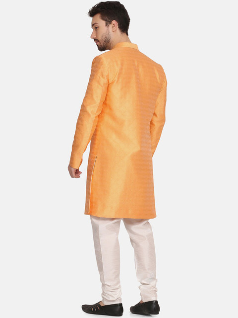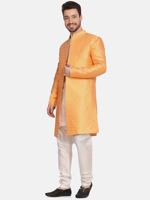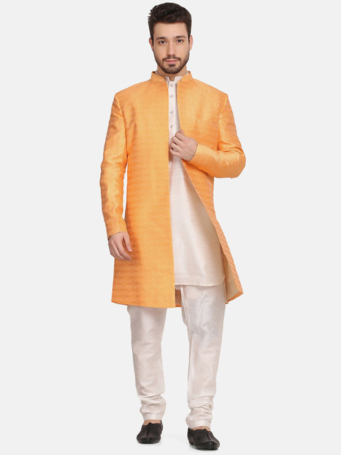 Peach solid sherwani set, has a mandarin collar, full-front button placket, long sleeves, a straight hem, and multiple slits
