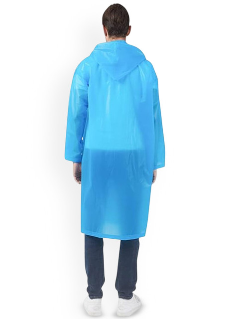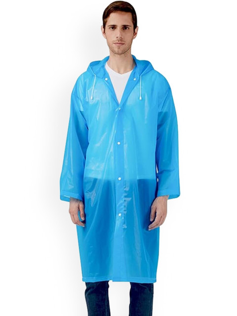 Blue solid rain jacket, has a self-attached hood that comes with a drawstring toggle and cord lock stopper with the front closure using snap buttons and a placket covering the zipper with velcro closure and long sleeves