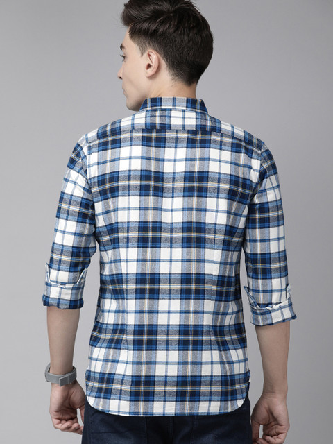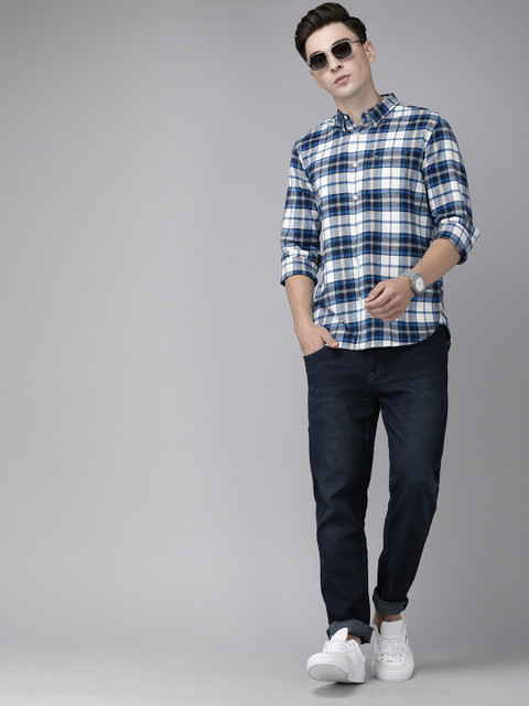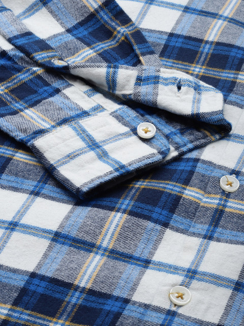 Blue and white tartan checks checked opaque Casual shirt ,has a button-down collar, button placket, 1 patch pocket, long regular sleeves, curved hem