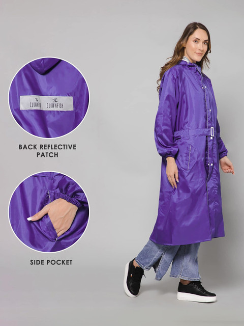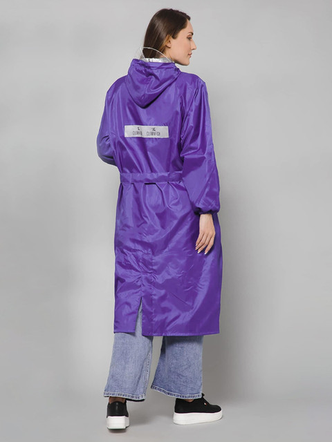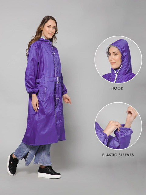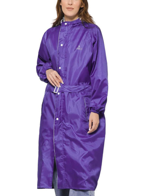 Purple solid rain jacket, has a self-attached hood that comes with a drawstring toggle and cord lock stopper with the front closure using snap buttons and a placket covering the zipper with velcro closure and long sleeves