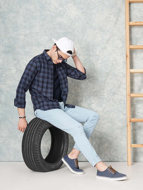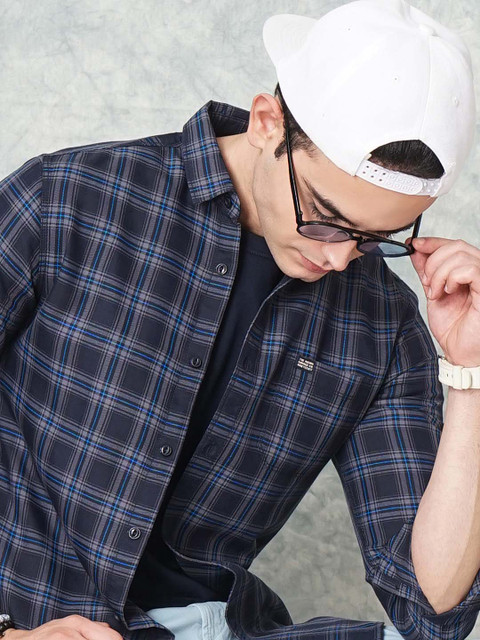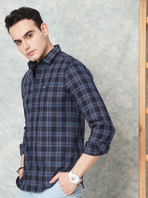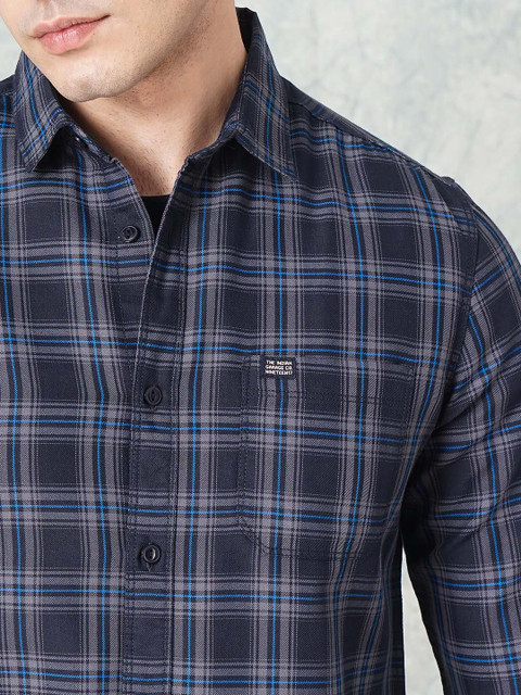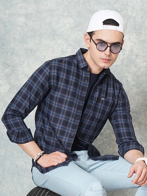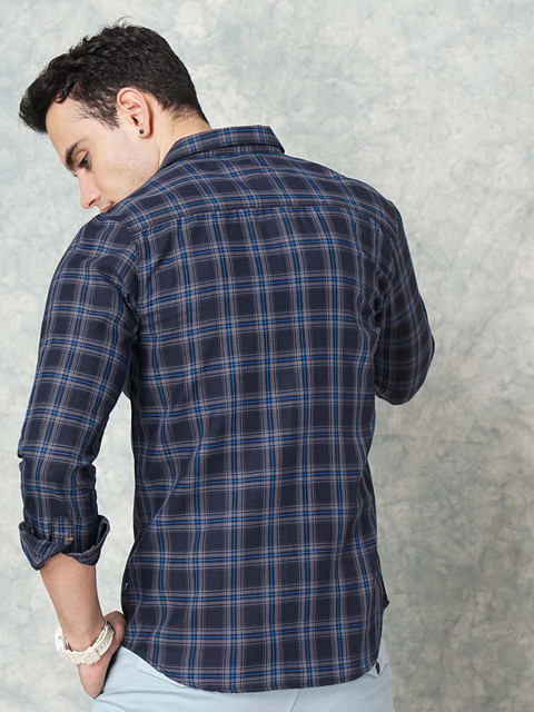 Navy blue tartan checks checked opaque Casual shirt ,has a spread collar, button placket, 1 patch pocket, long regular sleeves, curved hem