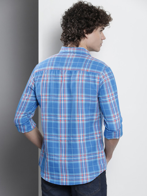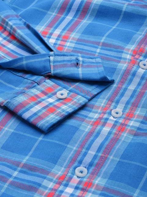 Blue tartan checked opaque Casual shirt ,has a spread collar, button placket, 1 patch pocket, long regular sleeves, curved hem