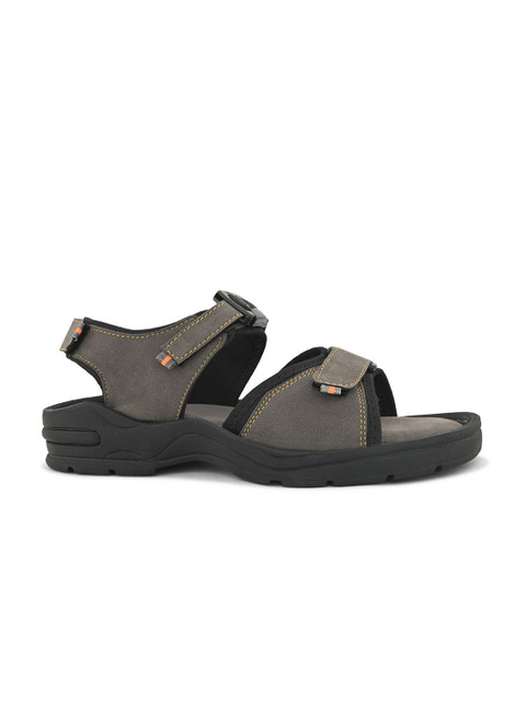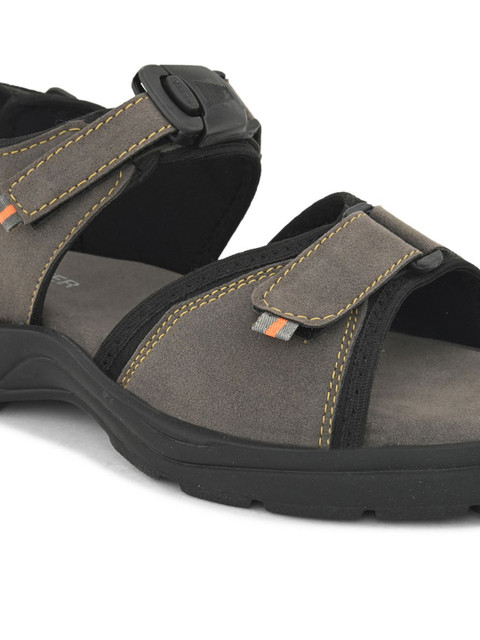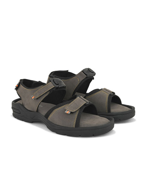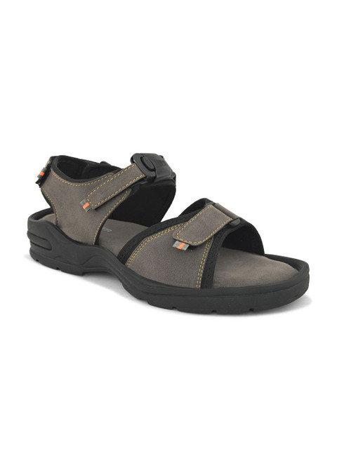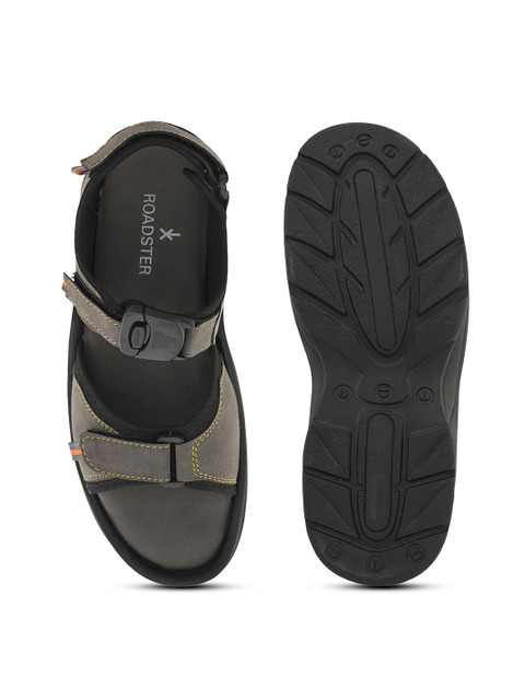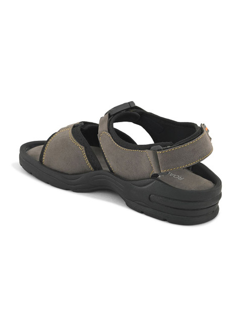 - A pair of grey solid round toe sandals with regular styling has a slip on closure