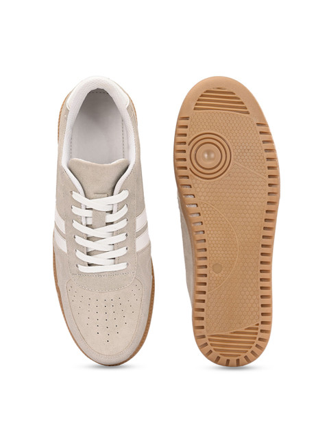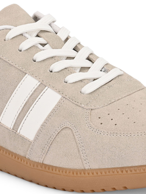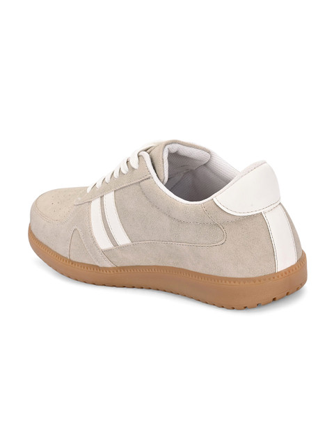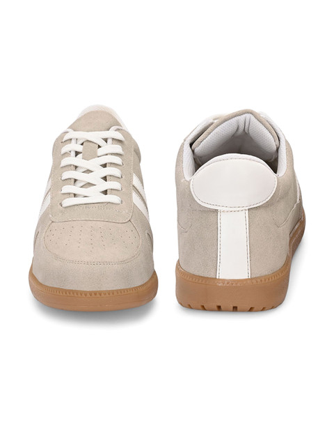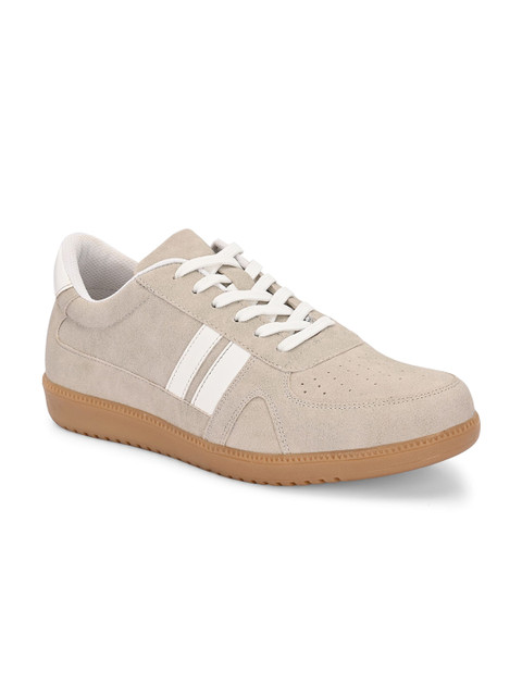 A pair of beige textured round toe regular sneakers with regular styling has a lace-up closure