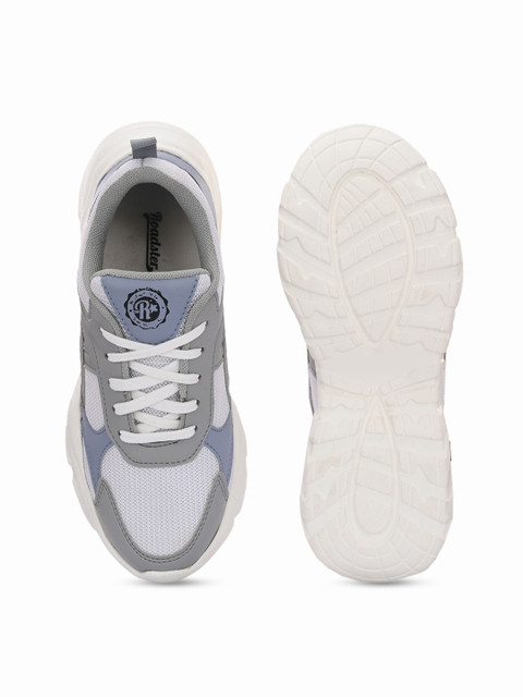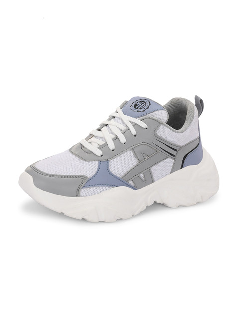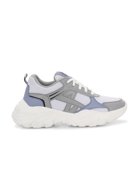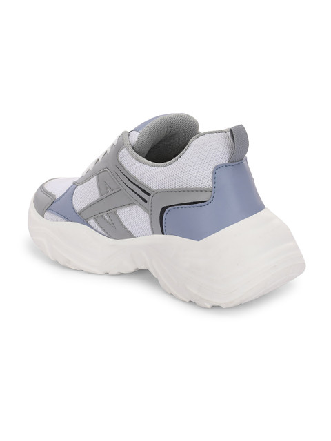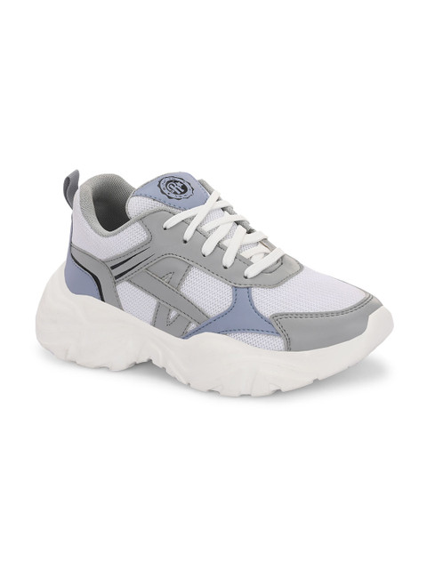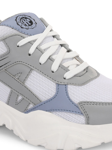 A pair of white and grey colourblocked round toe casual sneakers with regular styling has a lace-up closure