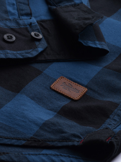 Teal blue and black checked casual shirt, has a spread collar, long sleeves, button placket, curved hem, and 1 patch pocket