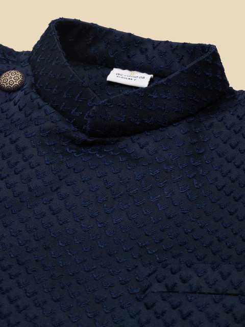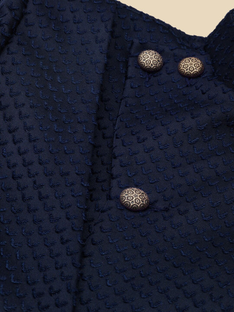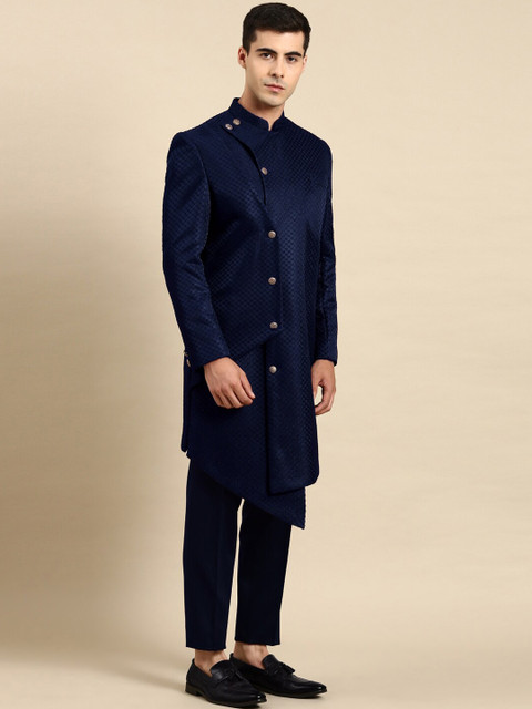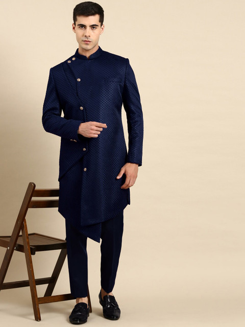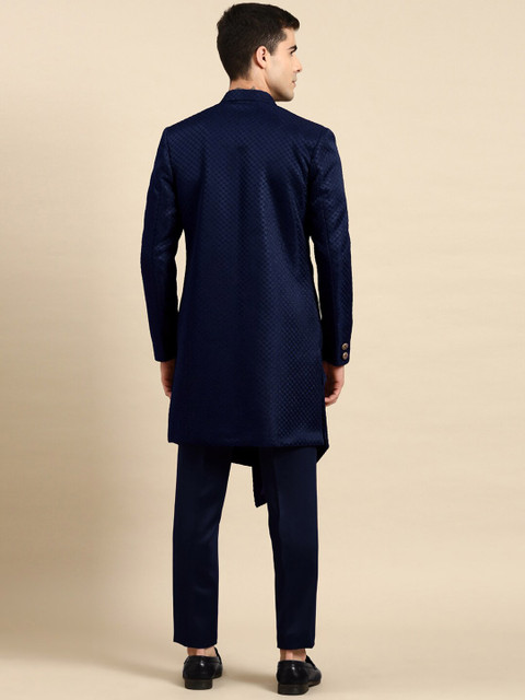 Navy blue self-design sherwani, has a mandarin collar, stylised front with button closures and long sleeves