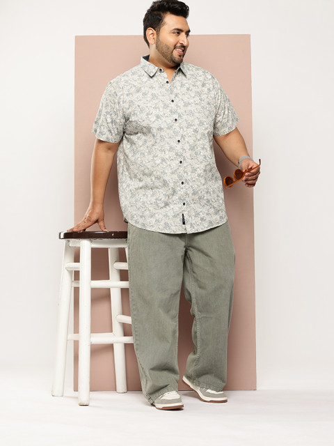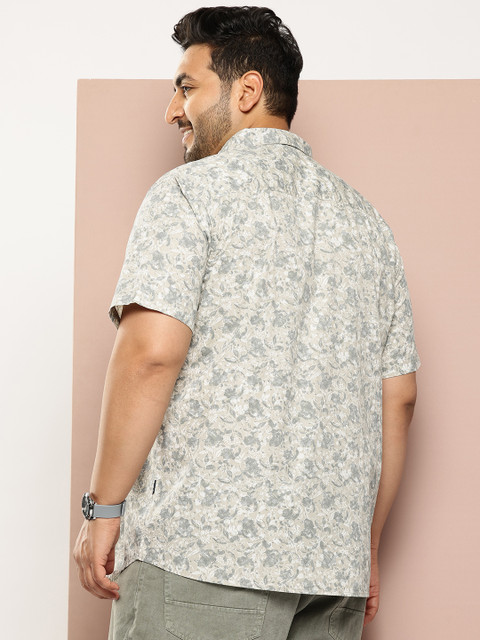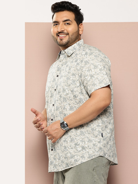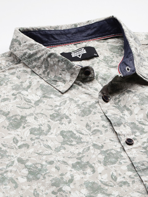 Grey floral printed opaque shirt, has a spread collar, button placket, 1 patch pocket, short regular sleeves, curved hem