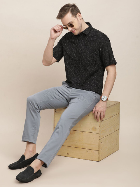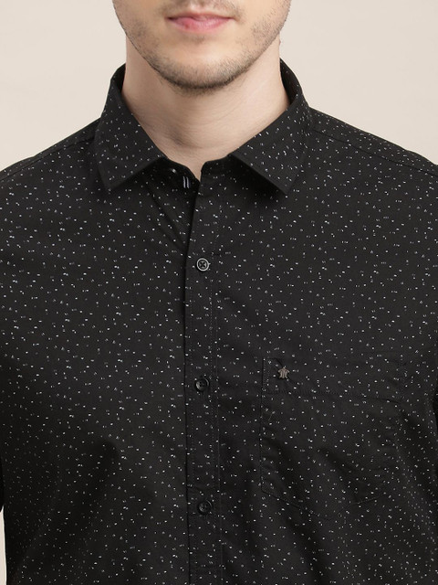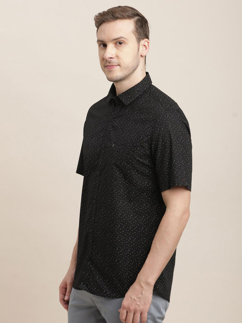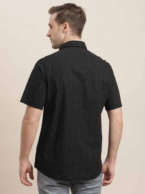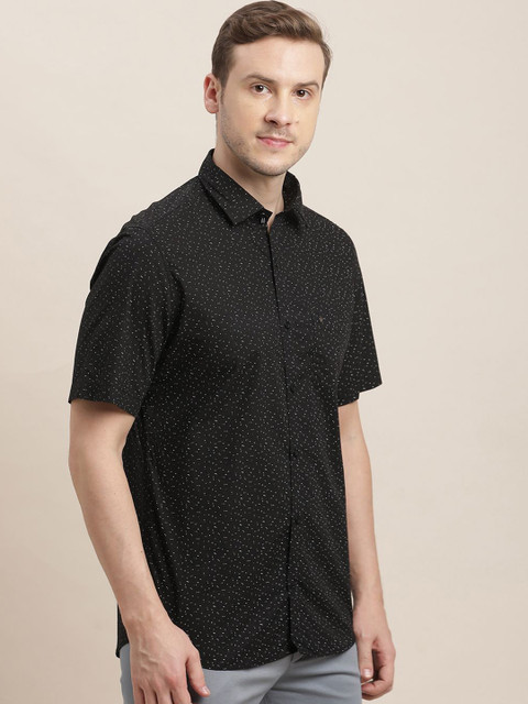 Black micro ditsy printed opaque Casual shirt ,has a spread collar, button placket, 1 patch pocket, short regular sleeves, curved hem