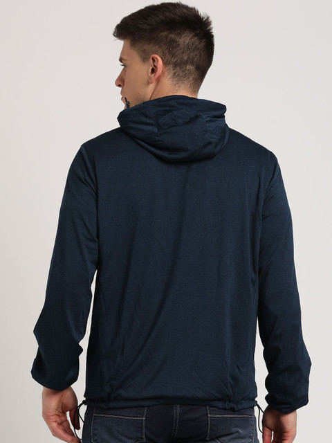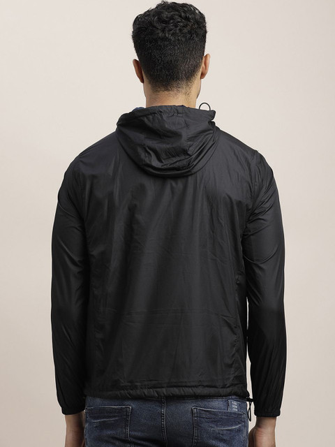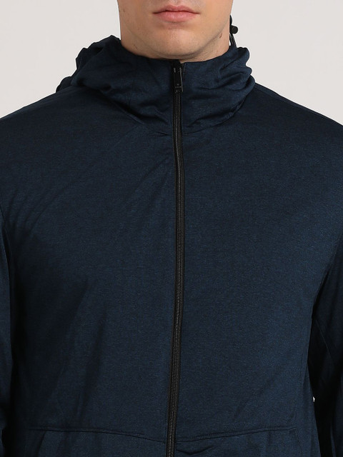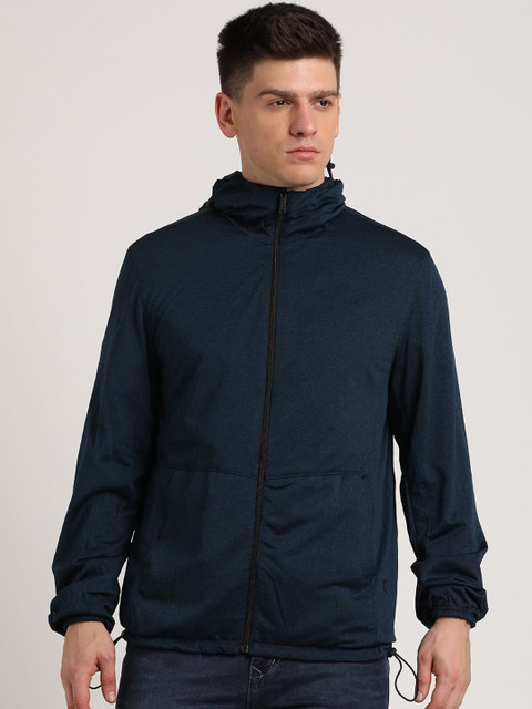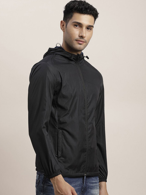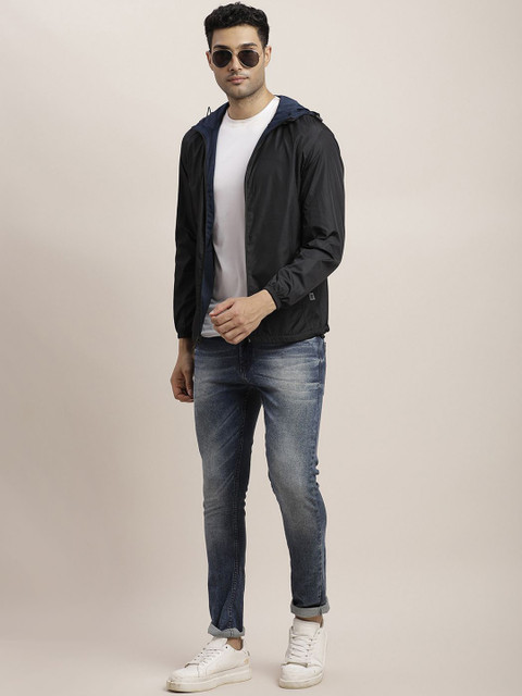 Black & blue solid reversible tailored jacket with zip detail, has a hooded, 2 pockets, has a zip closure, long sleeves, hem with toggle hemline, cotton lining