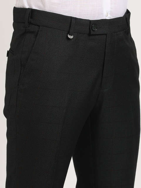 A pair of Black checked slim-fit mid-rise trousers, has a waistband with belt loops, a zip fly and a button closure, and four pockets