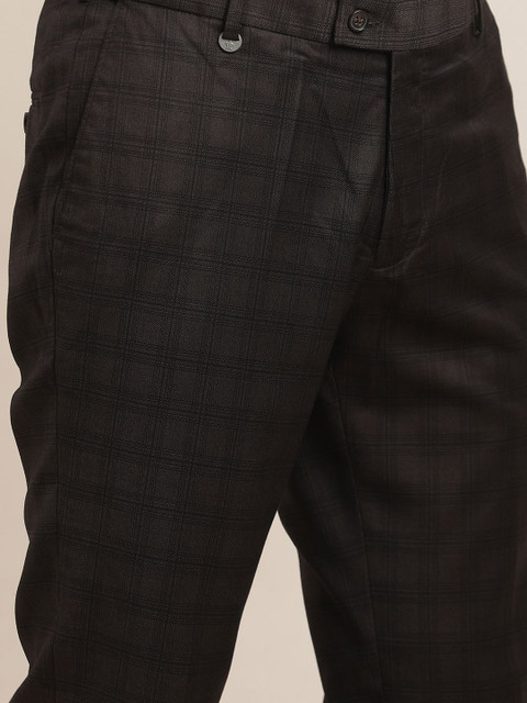 A pair of brown checked slim-fit mid-rise trousers, has a waistband with belt loops, a zip fly and a button closure, and four pockets