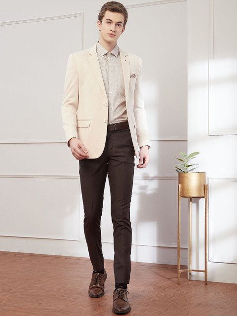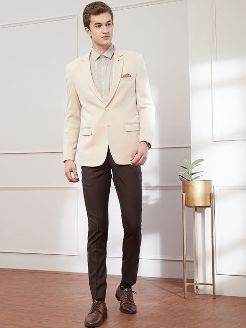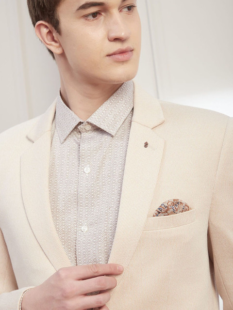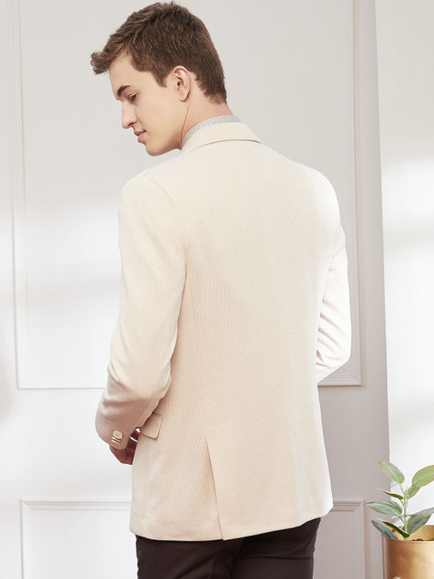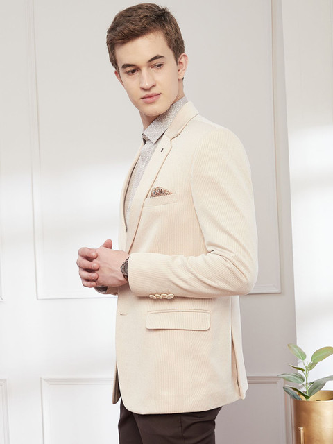 Beige striped regular-fit blazer, has a notched lapel collar, single-breasted with button closure, long sleeves, one welt pocket, two flap pockets, and double vented back hem