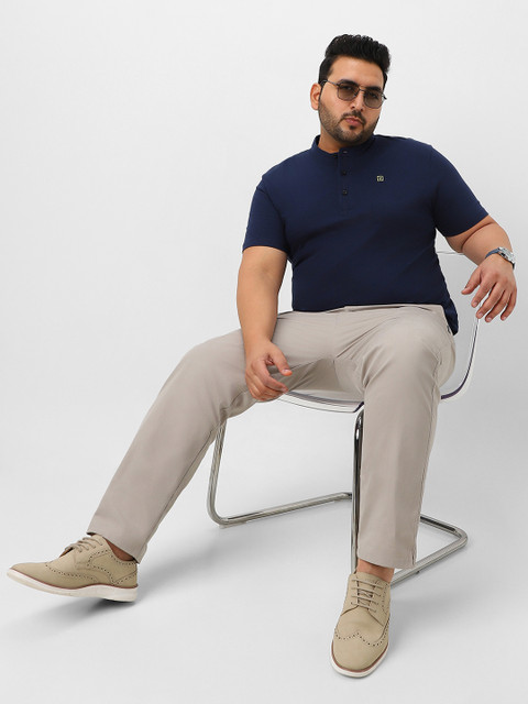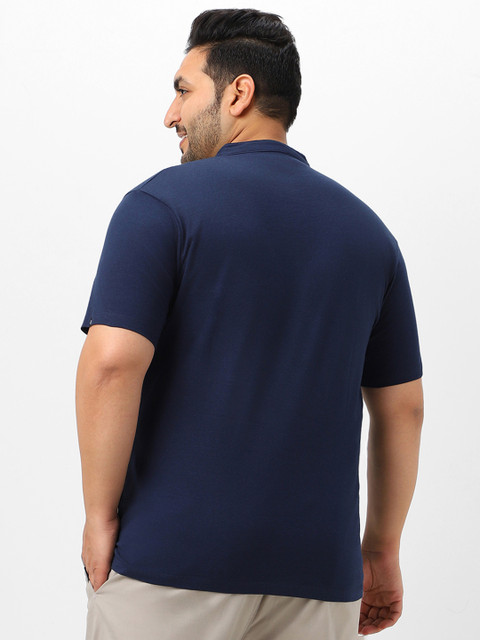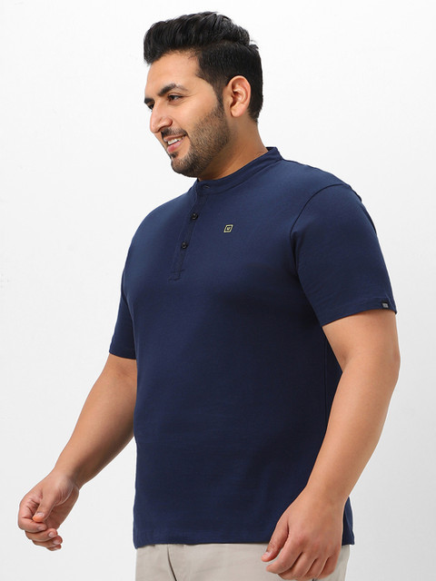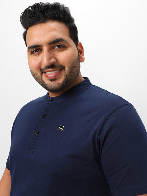 Blue solid T-shirt, has a mandarin collar, and short sleeves