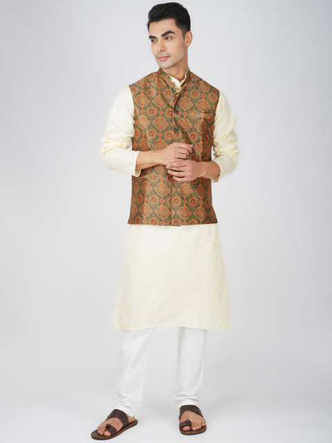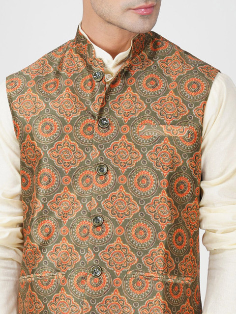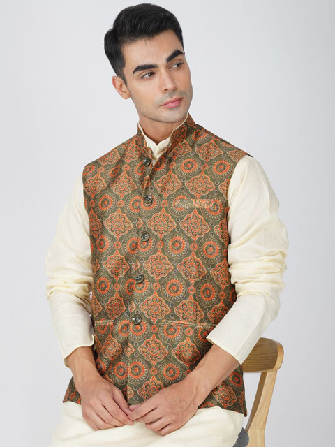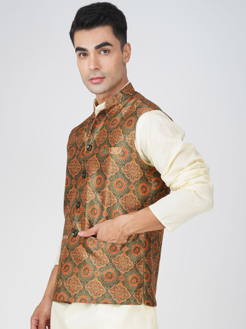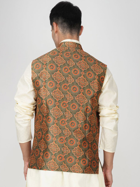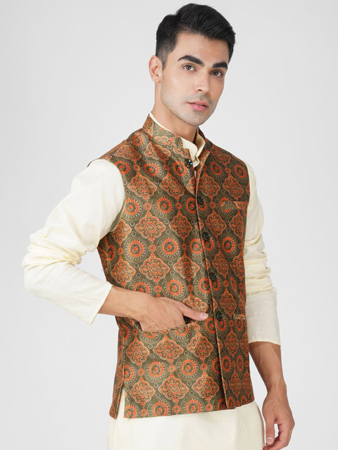 green printed woven Nehru jacket, has a mandarin collar, a full button placket, sleeveless, three pockets