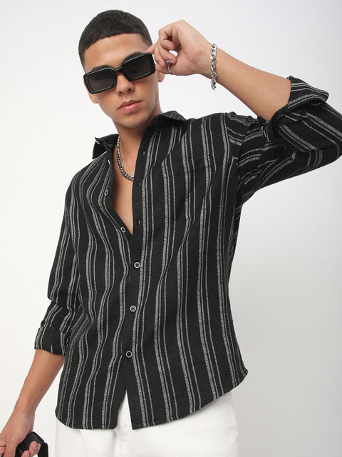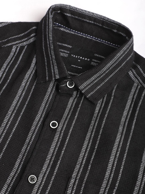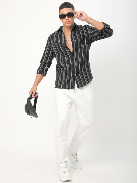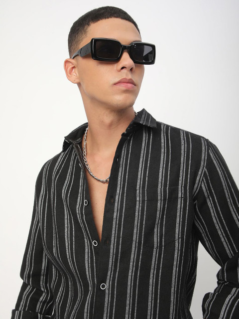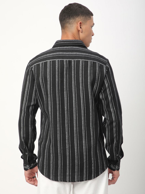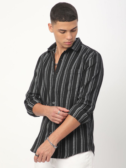 Black multi stripes striped opaque Casual shirt ,has a cutaway collar, button placket, 1 patch pocket, long regular sleeves, curved hem