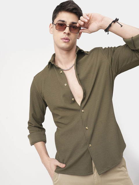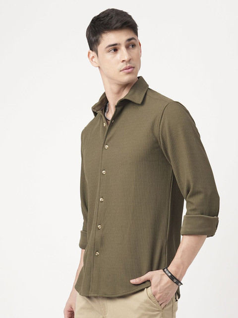 Olive green textured opaque Casual shirt ,has a cutaway collar, button placket,long regular sleeves, curved hem