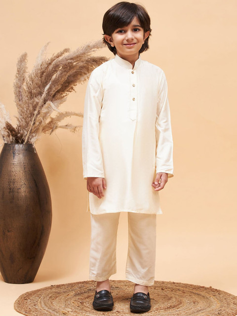 cream-coloured solid kurta, has a mandarin collar, a short button placket, long sleeves and side slits