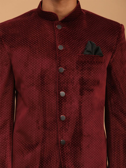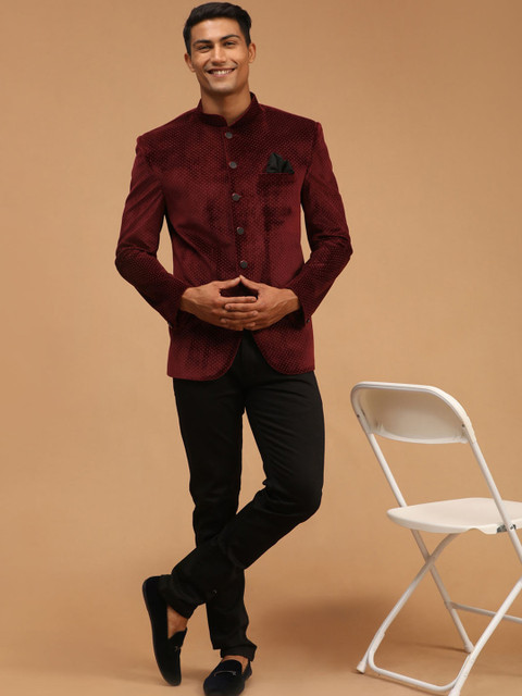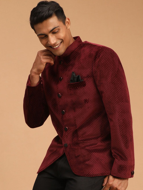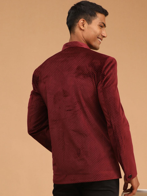 Maroon polka dot printed slim-fit bandhgala blazer, has a mandarin collar, long sleeves, a full button placket, 1 pocket, an attached lining, and vented sides