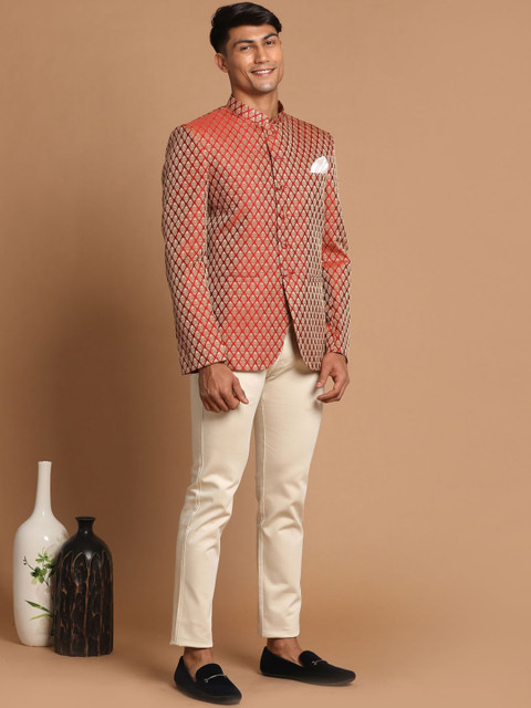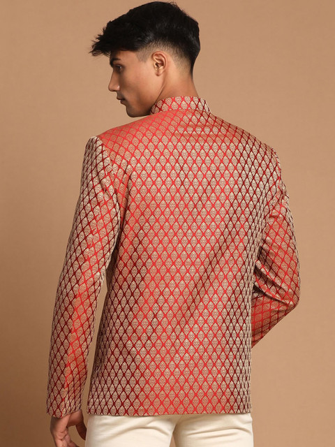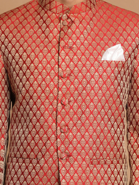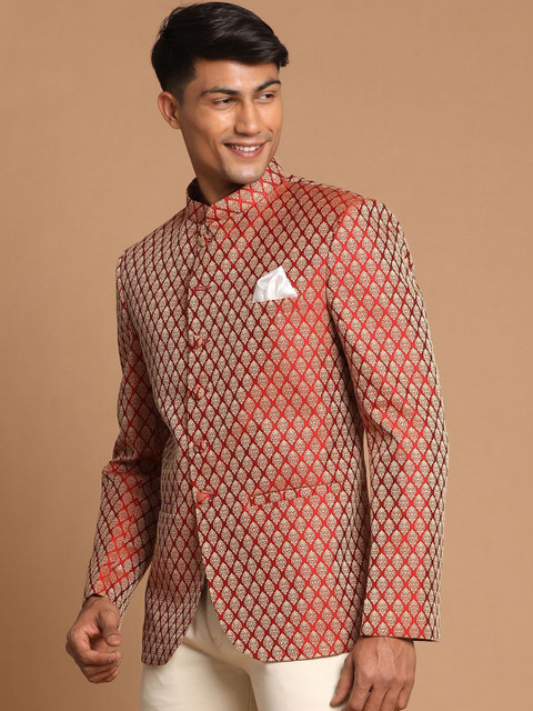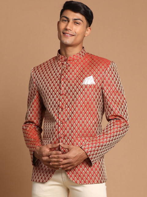Maroon self design slim-fit blazer, has a mandarin collar, bandhgala with button closure, long sleeves, one welt pocket, two flap pockets, and straight hem