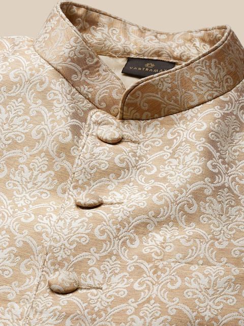 Gold-coloured self-design slim-fit ethnic Bandhgala blazer, has a mandarin lapel, long sleeves, bandhgala with single button closure, one welt pocket and a ventless back hem