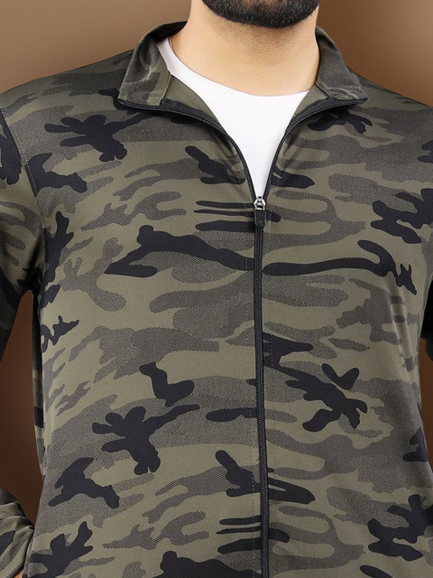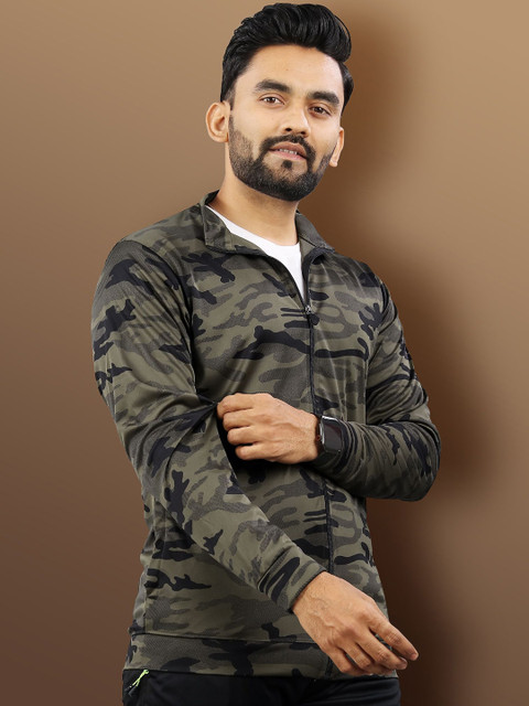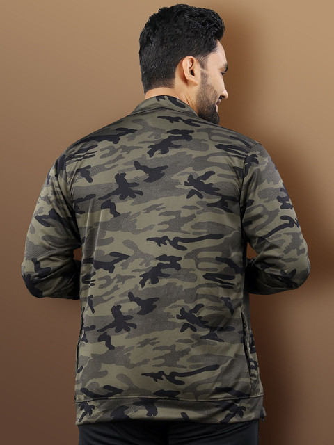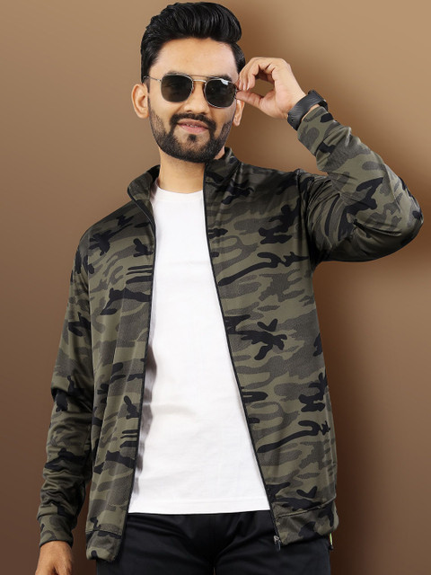 Green & black solid bomber with utility pockets, has a mandarin collar, 2 pockets ,has a zip closure, long sleeves, straight hemline, polyester lining engineered with rapid-dry
