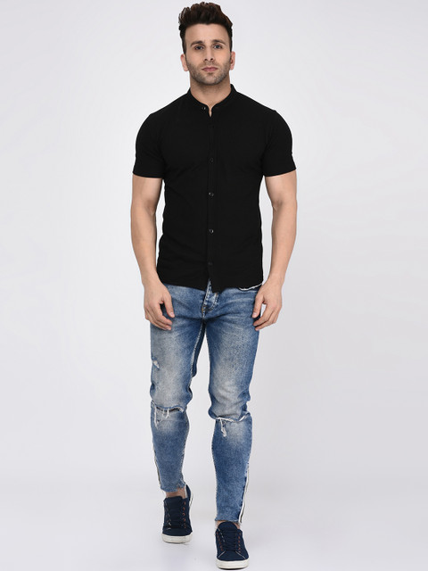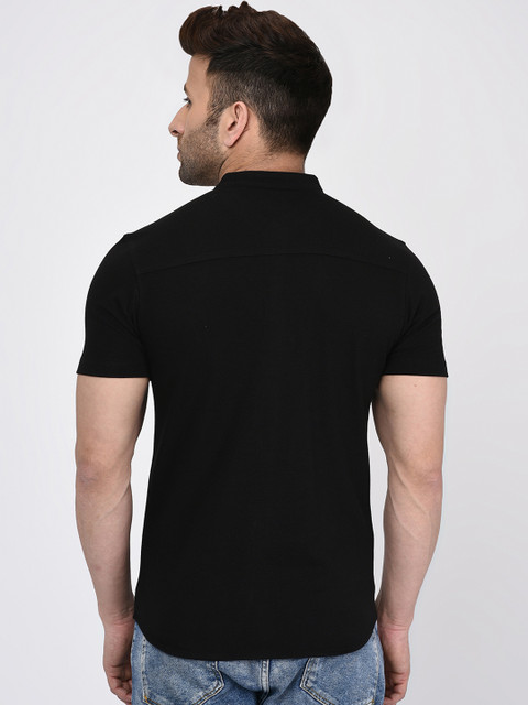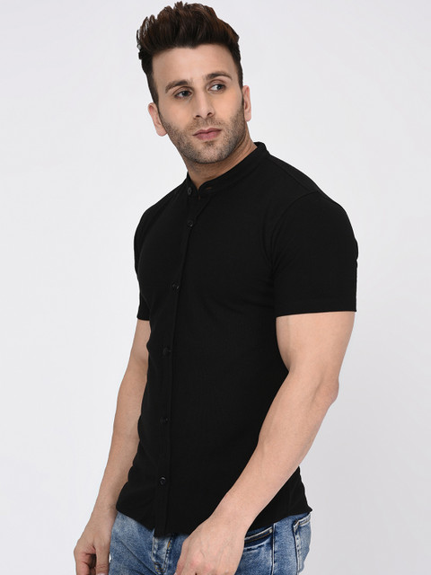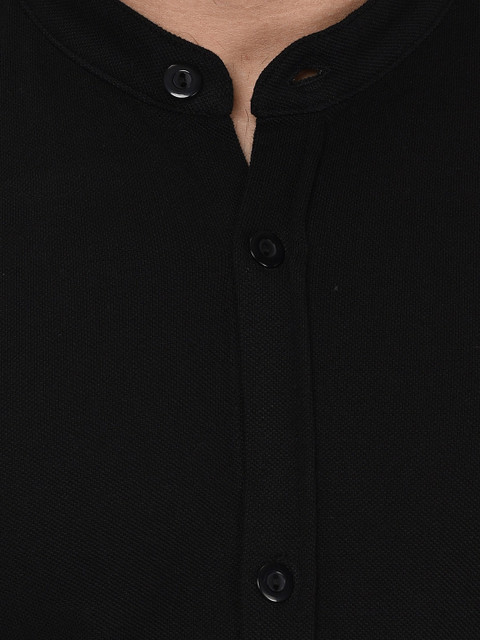 Black solid casual shirt, has a mandarin collar, short sleeves, straight hem