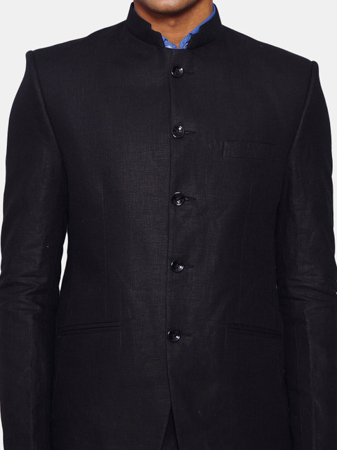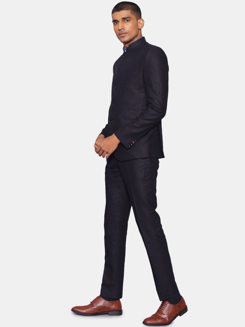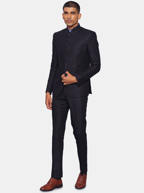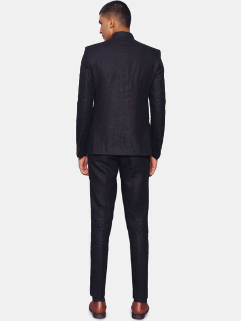 Black solid formal blazer has a mandarian collar, long sleeves, single-breasted with double-button closures, three pockets on the front, a double-vented back hem and has a lining